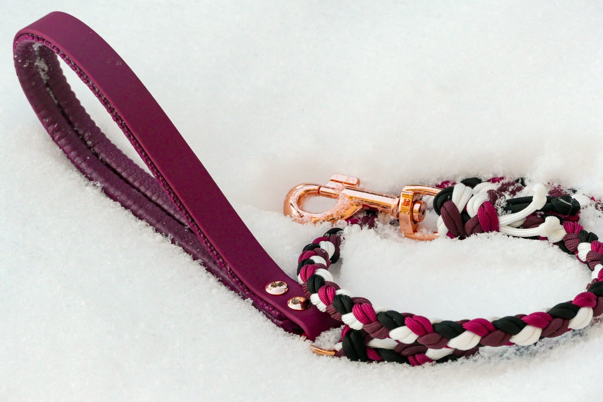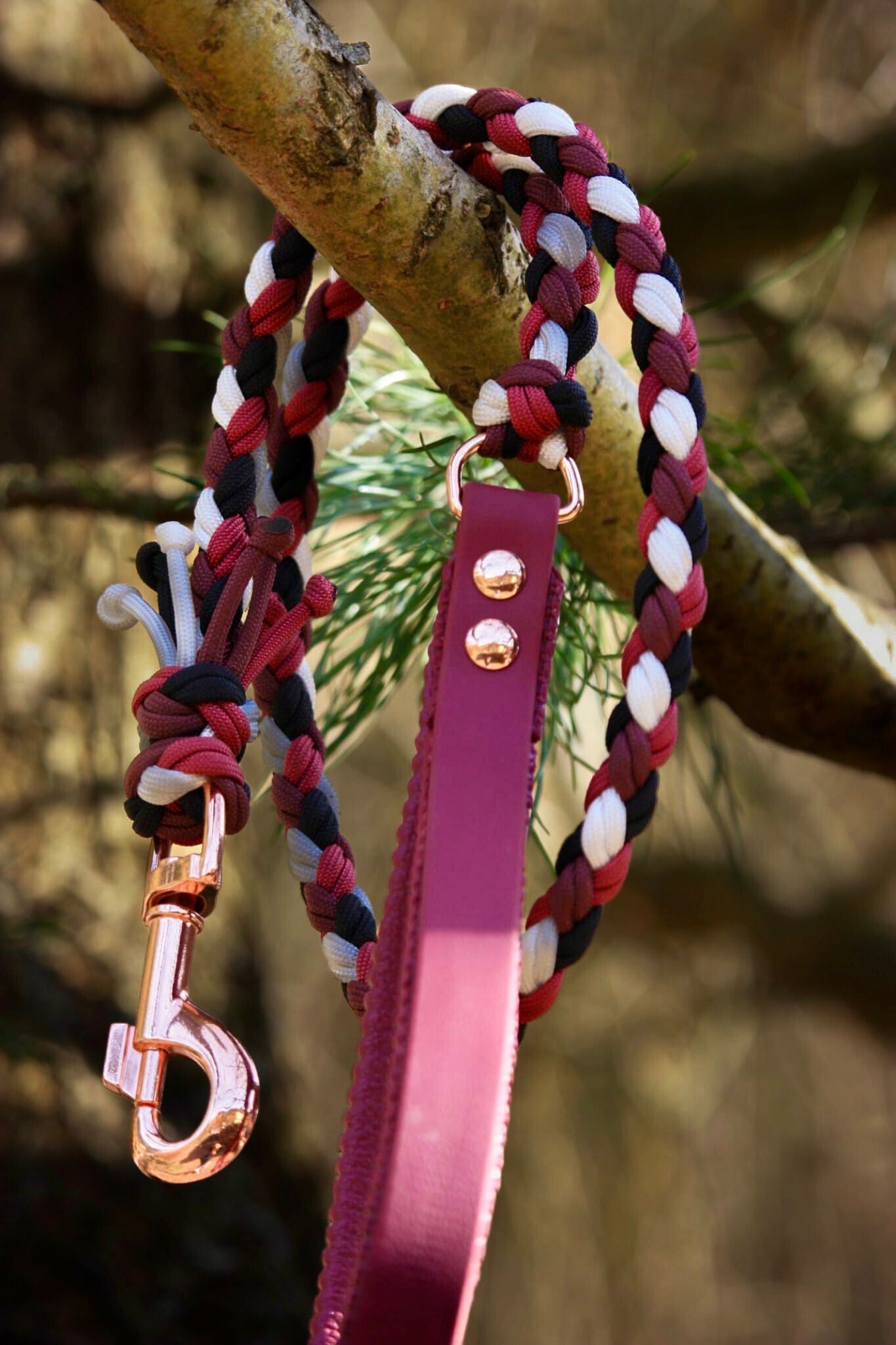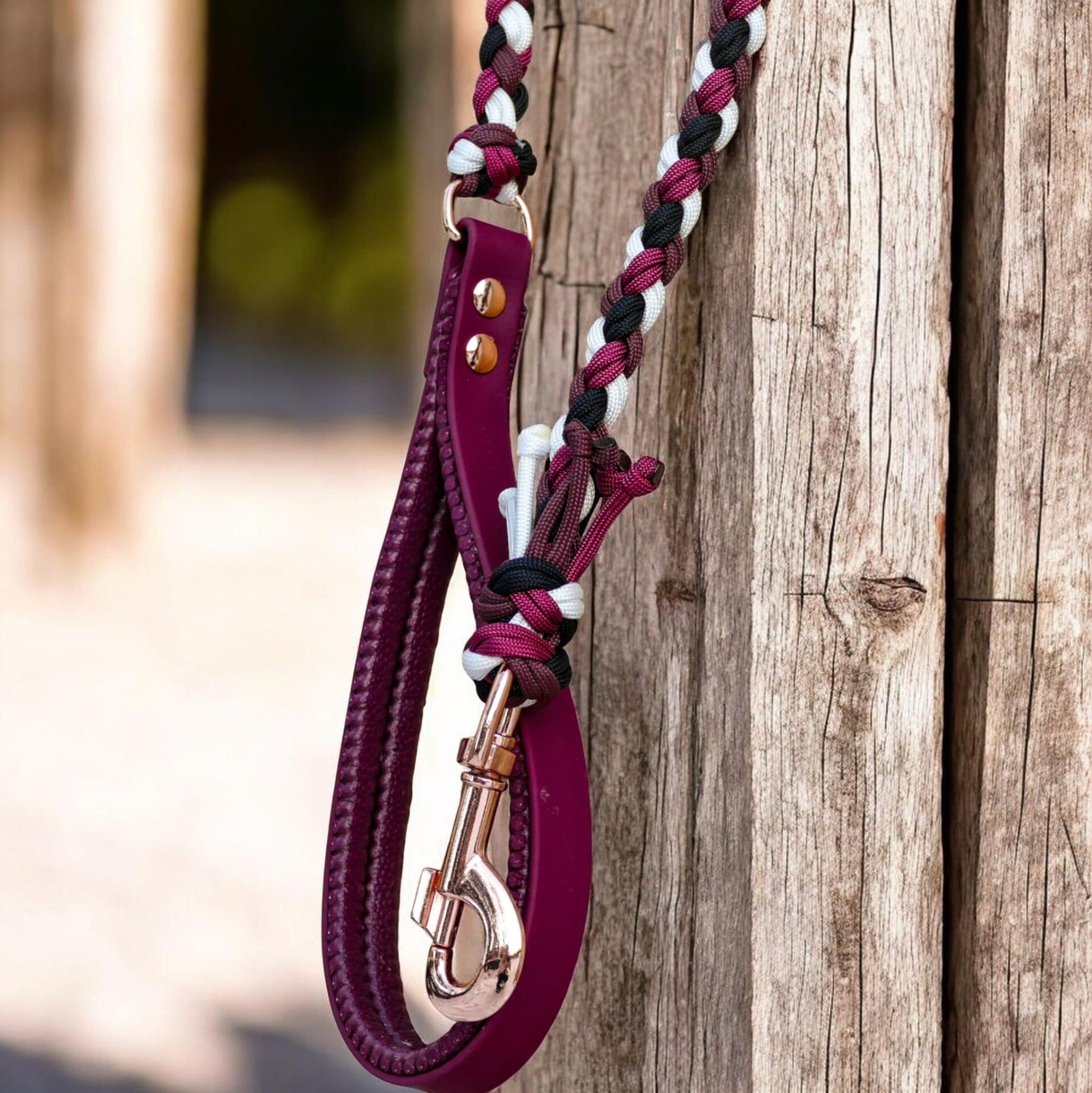 Leine Suki ist eine rundgeflochtene Leine aus Paracord mit einer Handschlaufe aus Biothane, die Biothane Handschlaufe kann für einen angenehmeren Griff gepolstert werden.