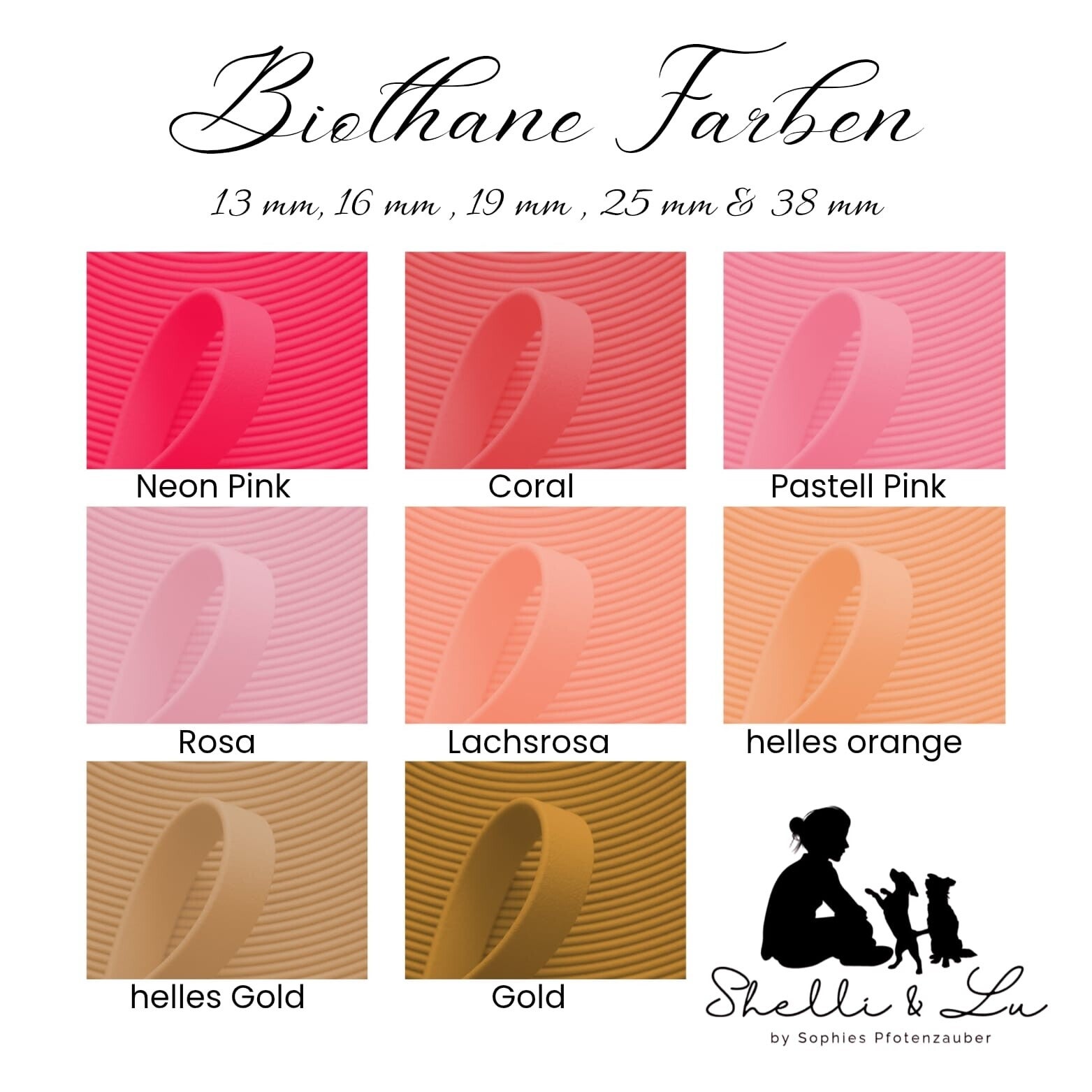 Aus Biothane mit Polster, für ein angenehmes Tragegefühl, verstellbar durch einen Kordelstopper.